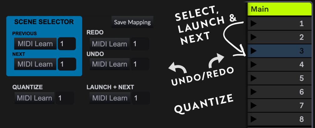 This max4live MIDI Device allows you to set a MIDI note or CC to trigger Undo/Redo, move through scenes, launch current scene and select next one and also quantize your midi clips, so you can control it all from your midi keyboard or pedal board.